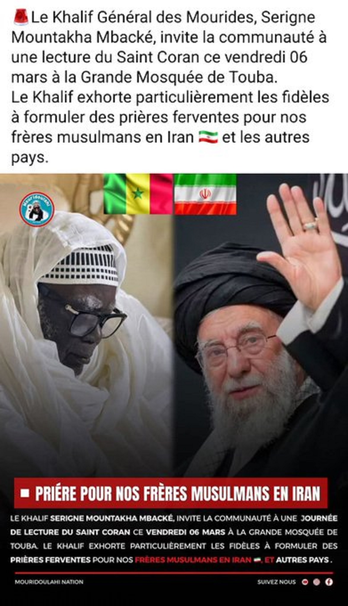 خلیفه سرین منتقا امباکه خلیفه طریقت مریدیه از مردم مسلمان سنگال دعوت کرد تا روز جمعه ۶ مارس ۲۰۲۶ علاوه بر حضور در مسجد بزرگ طوبی در سراسر کشور در مراسم روز تلاوت قرآن کریم و دعا برای برادران مسلمان ما در ایران و پیروزی ایران شرکت کنند.