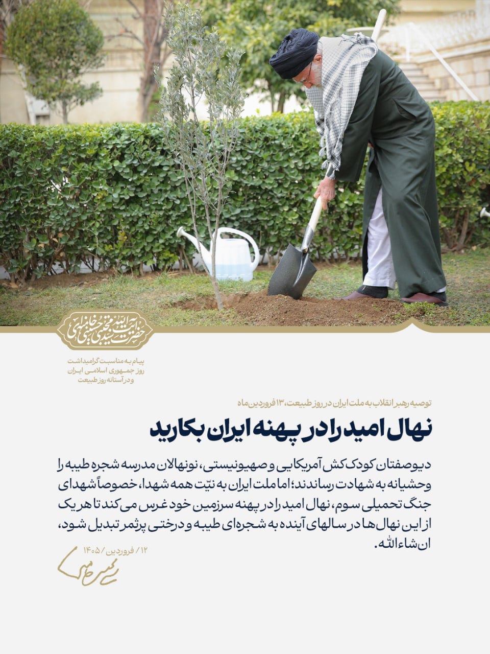 پیام حضرت آیت‌الله سیدمجتبی خامنه‌ای در خصوص روز درختکاری: نهال امید را در پهنه ایران بکارید.