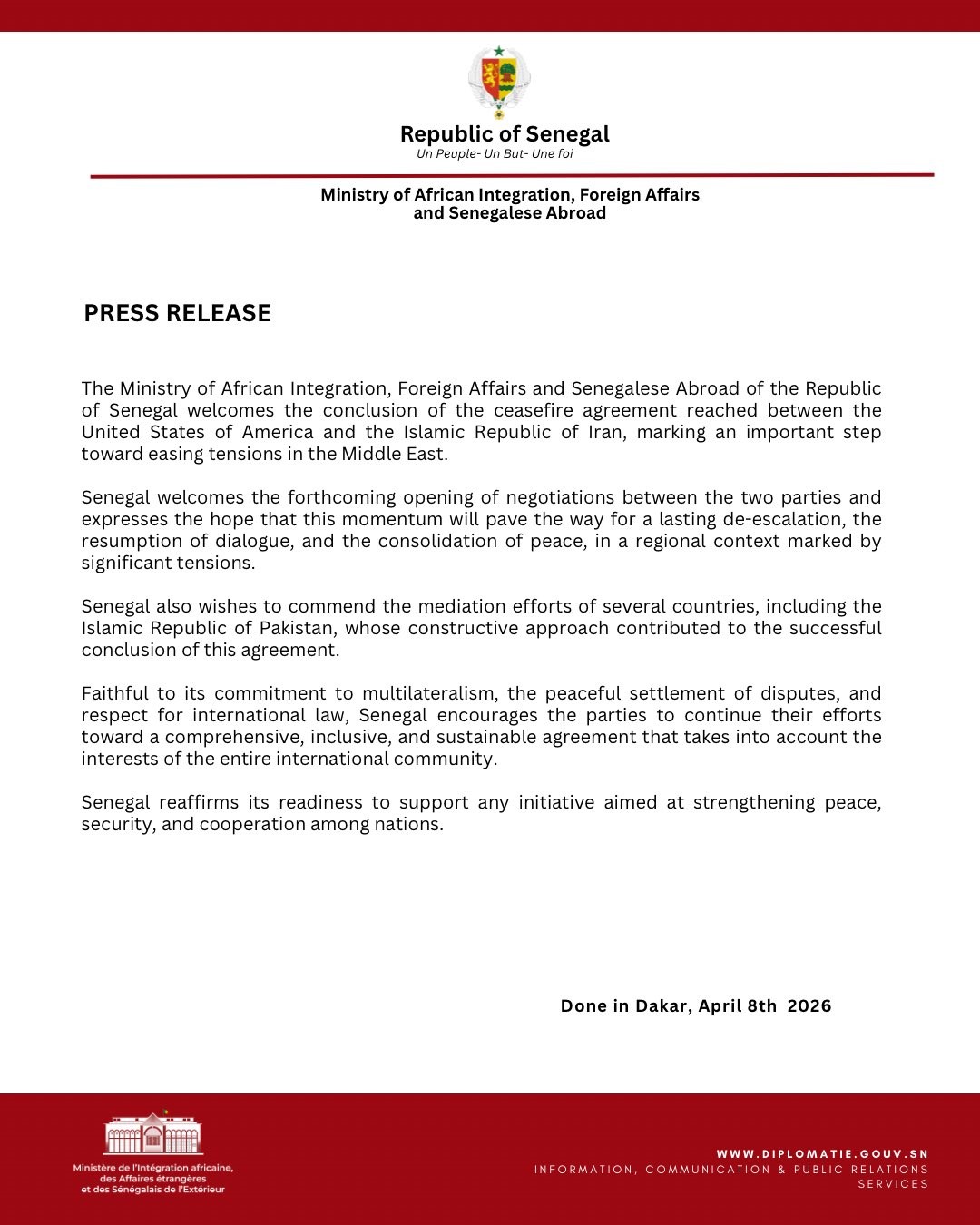 بیانیه مطبوعاتی وزارت امور خارجه سنگال در استقبال از برقراری آتش‌بس میان ایالات متحده آمریکا و جمهوری اسلامی ایران